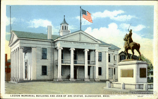 Front: LEGION MEMORIAL BUILDING 86147 LEGION MEMORIAL BUILDING AND JOAN OF ARC STATUE, GLOUCESTER, MASS. Back: AMERICAN ART COLORED
