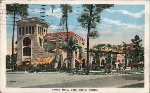 Front: Antilla Hotel, Coral Gables, Florida. Back: AIR MAN OLE fear Brother Georgie lovese DO Obat the Southe, talainless CASES them to Palun Mis E. Lauz Beach & Boles Torer tourrons 129 Staubridge ft Nonistown Lellie Pa