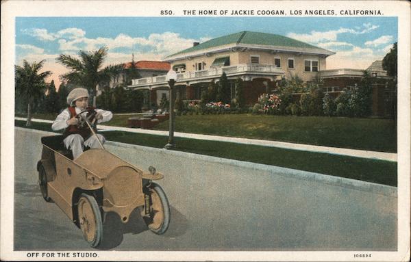 Front: 850. THE HOME OF JACKIE COOGAN, LOS ANGELES, CALIFORNIA. OFF FOR THE STUDIO. 106894 Back: 2. WESTERN PUBLISHING & NOVELTY CO., LOS ANGELES, CAL.
