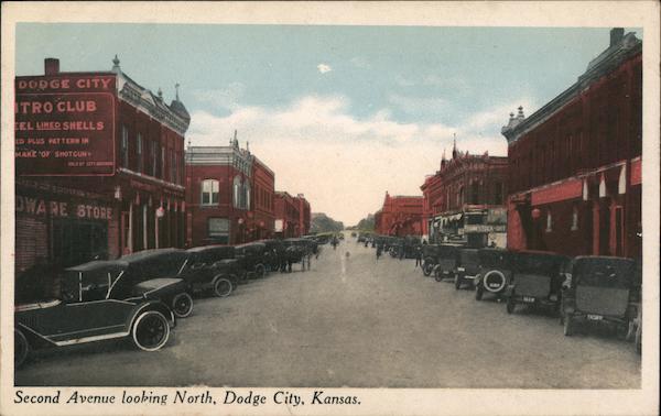 Front: DODGE CITY TRO CLUB EL LINED SHELLS ED PLUS PATTERN IN MAKE 'OF SHOTGUN $OLB BY CITT&R EISCLOTHING OWARE STORE HIRAMTBU 16STOCK-DRT Second Avenue loohing North, Dodge City, Kansas. Back: 18 42 CU 7298