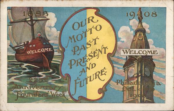 Front: 1683 OUR MOTTO PAST PRESENT 19408 WELCOME WELCOME ARNversa Founder Week FiruRE Philadefo fa 99 Back: le CON 3.50 #2 Welectriva safe have ainee place peenty to esta sen felry is Srlendsd a to you fout ll VIANA Mother 怎 R