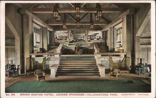 Front: No. 214 GRAND CANYON HOTEL, LOUNGE STAIRCASE-YELLOWSTONE PARK, HAYNES-PHOTO. Back: [Stamp Here] Domestic, 1c MESSAGE. Foreign, 2c