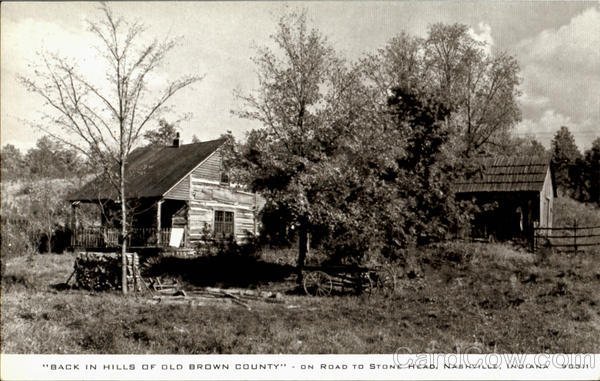 Front: "BACK IN HILLS OF OLD BROWN COUNTY" ON ROAD TO STONE HEAD, NASHVILLE, INDIANA 90311 Back: ORIGINAL CAMERA STUDY - REPRODUCTION RIGHTS RESERVED C. R. CHILDS CO., 5707 LAKE ST., CHICAGO TRADE REG MARK