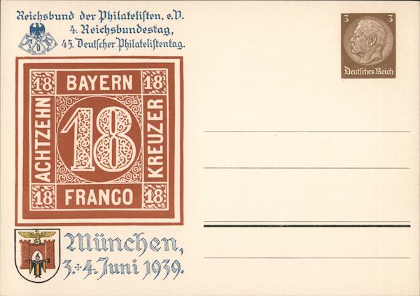Front: Reichsbund der Philatelisten, e.V. 4. Reichsbundestag, 45. Deuiſcher Philateliftentag. 3. Deutfches Reich 18 BAYERN 18 18 18 FRANCO 18 München, Vov3.4.Juni 1939- ACHTZEHN KREUZER Back: München, Hauptſtadt der Bewegung, 3. und 4. Juni 1939