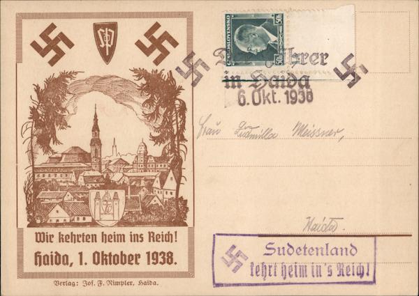 道rer COOC in Saida %23 6.0kt. 1938 uamillar Meissnar, ARA Wie kehrten heim ins Reich! Sudetenland haida, 1. Oktober 1938. tehrt heim in's Reig1 Verlag: Jof. F. Rimpler, Haida. CESKOSLOVENSKO 40S