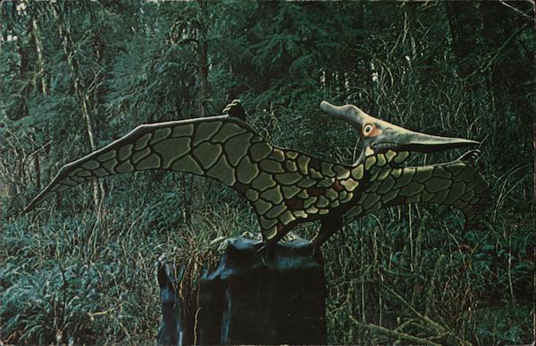 | Which means "winged and toothless", was the largest of the flying reptiles, with a wing-span of 25 to 30 feet. Their fossil skeletons indicate that they were better gliders than flyers, and their huge toothless beaks indicate that they were probably fish eaters. Pteranodon became extinct 75 million years ago, and his replica may be seen at the Gardens on Oregon Coast Highway 101. |