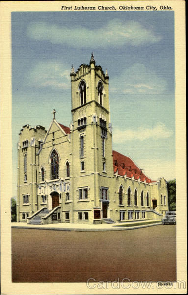 Front: First Lutheran Church, Oklahoma City, Okla. 5B-HS52 Back: MID-CONTINENT NEWS CO., OKLAHOMA CITY, OKLA. 1300 N. Robinson FIRST LUTHERAN CHURCH Oklahoma City