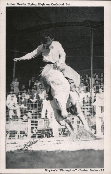 Front: Junior Martin Flying High on Carlsbad Bat SeaYKER OPYRIGHT Stryker's "Photogloss" - Rodeo Series - 20 Back: 1C DISTRIBUTED BY MARVIN D. EVANS CO., FORT WORTH, TEXAS