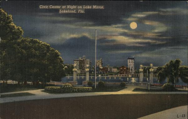Front: Civic Center at Night on Lake Mirror, Lakeland, Fla. L-13 Back: LAKELAND NEWS CO., LAKELAND, FLA. 8A-H1304