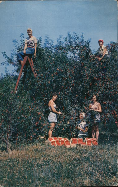 CHERRY PICKING Lake Erie fruit growing district and vacation land. East Main Road, Western New York and Pennsylvania States. Thomas Studio 418 Water St., Warren, Pennsylvania 19254-2 All Photograph rights reserved by C. S. Thomas S11751