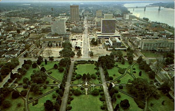 South view from Louisiana Capitol showing the beautifully landscaped front gardens and down-town Baton Rouge on the bank of the Mississippi River