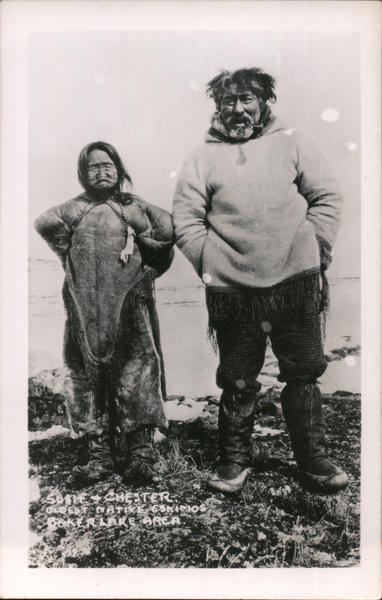 Disabled elderly woman wearing fur/animal skin clothing. Elderly man wearing similar clothing. Both standing in front of Baker Lake.