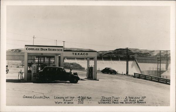 Front: COULEE DAM SERVICE TEXACO STOP GRAND COULEE DAM LENGTH AT TOP 4300 feet. HEIGHT --550 500 POWER PLANT-2,700,000 HP ÄŚREATES LAKE WATER FALL TWICE THE HEIGHT OF NIAGRA -3B E 151 MILES LONG %3B WIDTH AT BASE Back: ES POST CAR