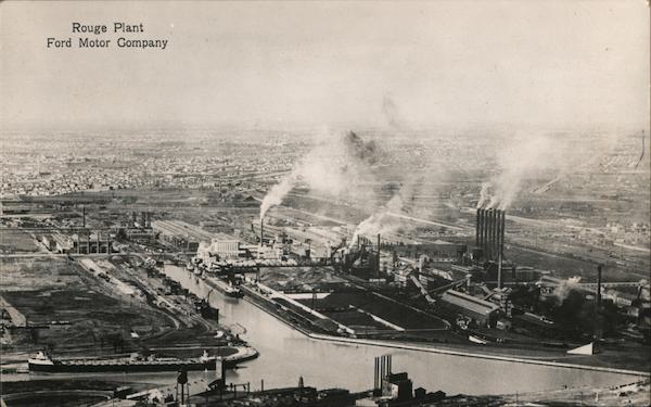 THE ROUGE PLANT is one of the largest industrial centers in the world. It has an area of 1,096 acres, 14 miles of roadways, 92 miles of railway track and 1 1/3 miles of docks. It includes blast furnaces, open hearth furnaces and steel mill, glass plant, foundry, paper mill, cement plant, body plant, coke ovens, power plant and motor assembly plant where new Model A engines are built. |