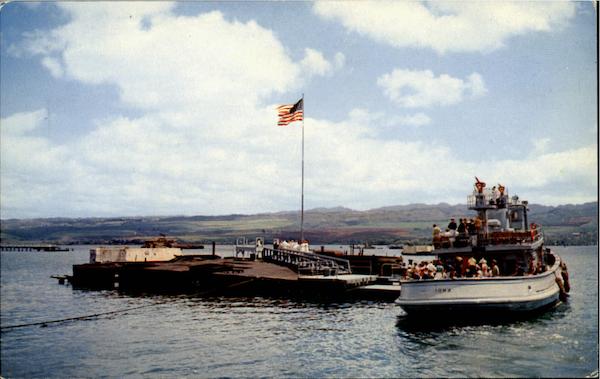 Remains of U.S.S. Arizona, Pearl Harbor, Hawaii, where 1,102 service men still lay at rest, as a result of the Pearl Harbor attack of 1941. Navy tug brings visitors to pay homage. Sugar cane fields of Oahu in distance.