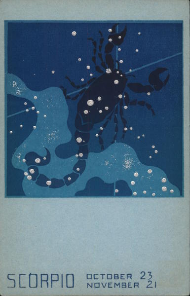Front: SCORPIO OCTOBER 23 NOVEMBER 21 Back: HAND MADE Original Serigraph Z3 PUBLISHED BY M. A. SHEEHAN, TOPANGA, CALIFORNIA - THIS EDITION IS LIMITED TO TWO THOUSAND SETS THIS CARDIS PAAT OF SET NO