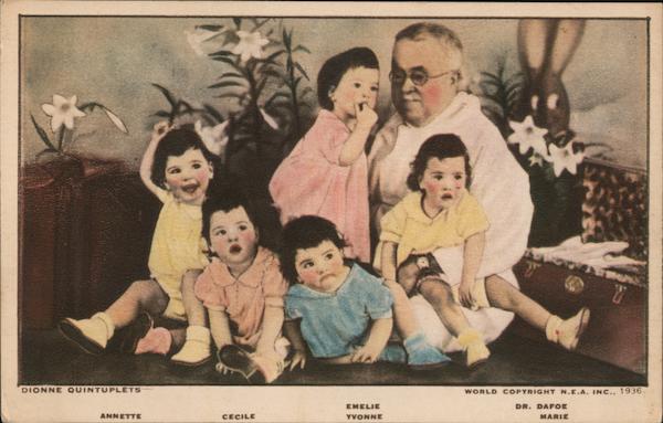 Front: DIONNE QUINTUPLETS WORLD COPYRIGHT N.E.A. INC., 1936 EMELIE DR. DAFOE ANNETTE CECILE YVONNE MARIE Back: Made in Canada