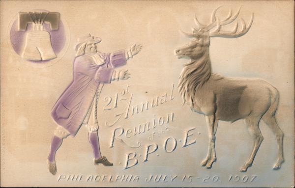 Front: 21 Peunion of the BPOE PHILADEL PHIA JULY 15-20 1007 Back: Flace Stamp tere Dorestic Canada Cuba Ivexico, Pawaii Philippines Porto Rico ht Hea 109 NA མ མཁས་པས་ན་