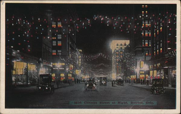 Front: BAP NEMAY YAN BROS ELE O 1913 H.H.T 5210. Champa Street at Night, Denver, Colo. Back: DOMESTIC: 125 Aug వున్న FOREIGN: HoHop-O