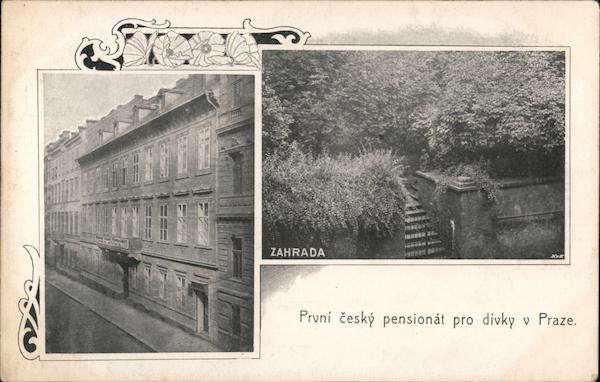 Front: hon Csi PERSAT PRO DIYK ZAHRADA První český pensionát pro dívky v Praze. Back: Reprodukce Husník a Häusler v Praze. DOPISNICE