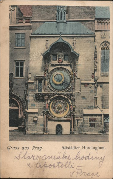 Front: Gruss aus Prag. Alts tädter Horologium. starvanicke hoding 2 apostolli rPrage Back: K. Zuna, Kgl. Weinberge 716. Eigenes Kolorit Postkarte.