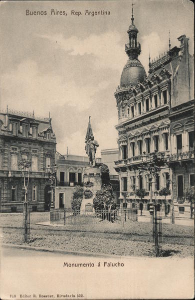 Front: Buenos Aires, Rep. Argentina Monumento á Falucho 718 Editor R. Rosauer, Rivadavia 522. Back: K-o Tarjeta postal. Carte postale. Union postale universelle.