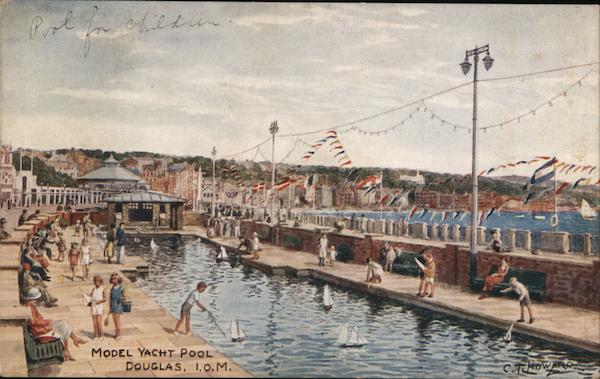 Front: Pol chilten MODEL YACHT POOL DOUGLAS, I.o.M. Back: COPYRIGHT. PRINTED AND PUBLISHED BY J. SALMON LTD., SEVENOAKS, ENGLAND FROM AN ORIGINAL WATER COLOUR DRAWING BY C. T. HOWARD keep TRADE *4013 MARK England in