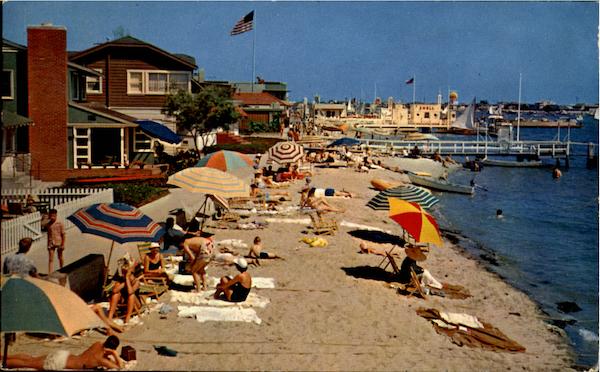 Sunning on the clean, sandy beach between homes along South Bay Front and Balboa Bay. The Balboa Island Ferry Landing is in the distance.