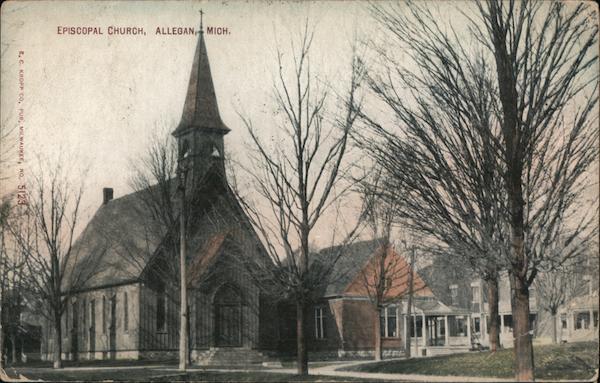 Front: EPISCOPAL CHURCH, ALLEGAN MICH. E, C. KROPP co, PUB, MILWAUKEE, NO, 5123- Back: U.S.POSTA E Sa ELEC CENA 29 gegnhapel 1914 hlagan 124Arbor sl. Cand from T.3.80 mich Post Gara 303 Hemlock at Putebing lenna Heils Ema