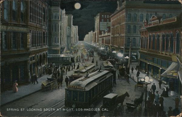 SPRING ST. LOOKING SOUTH AT NIGHT, LOS ANGELES, CAL.