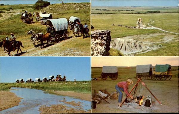 | Kansas covered wagon vacations. Americans discover pioneer life on an authentic wagon train, riding saddle horse or shotgun stage coach or wagon, along 60 miles of original prairie trail. Indian raids, camp fire programs, Fossil hunting scenery and solitude occur "100 years ago", yet only a few miles form Interstate 70. Trips of Wagons Ho, Inc., of 1 to 5 days, with everything furnished for modern pioneers, originate out of Quinter, Kansas. |