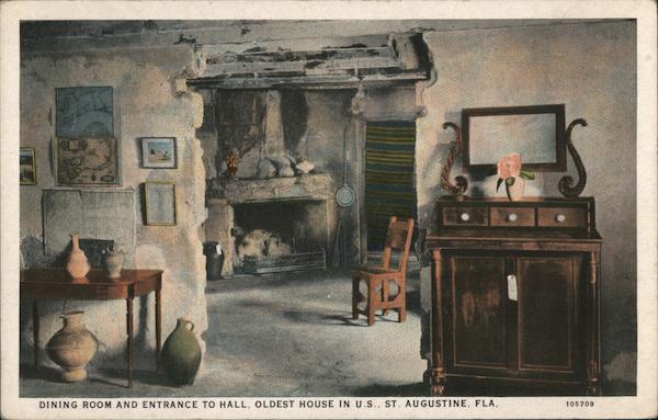 Front: DINING ROOM AND ENTRANCE TO HALL, OLDEST HOUSE IN U.s., ST. AUGUSTINE, FLA. 105709 Back: PUBLISHED BY W. J. HARRIS CO., ST. AUGUSTINE, FLA. MADE IN USA AMERICAN ART COLORED C. T.
