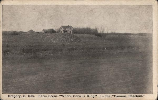 Front: Gregory, S. Dak. Farm Scene "Where Corn is King." In the "Famous Rosebud." Back: DOMOS ONE CON PORTOM VOCE wa This brahs like the te lorie inte thing Fe corte. Coming Lurne I arr. drifts abung The nrad - like znon saud