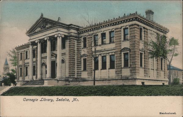 Front: Carnegie Library, Sedalia, Mu. Handcolored. Back: 50¢ (Gornsny. ക്കുക. Chas. E. West, Bodalis, Mo. H. 68848 Bios POR TM ADORO6.