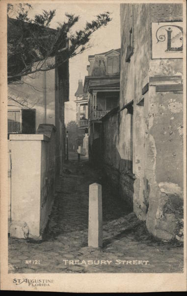 Front: No 121 TREASURY STREET. ST AUGUSTINE FLORIDA Back: Pop 2- Domestic 1 Ct. Foreign 2 Cts. THE ALBERTYPE CO.! BROOKLYN, NY. Would like to have met haar befee for sad opes, Well say. - ?