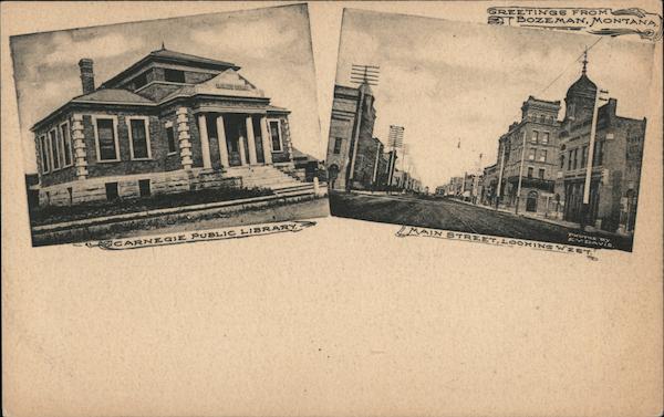 Front: GREETINGS FROM 2T BOZEMAN, MONTANA, CALLISTE LESEN TO: NO SMAIN STREET, LOOXINS WEST PXOTOS BY EN.pavis. BACARNEGIE PUBLIC LIBRARY Back: Domestic 1 Ct. Foreign 2 Cts. THE ALBERTYPE GO! BROOKLYN, NY.
