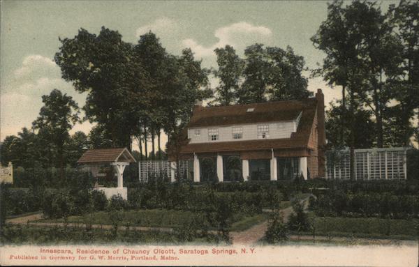 Front: Innescara, Residence of Chauncy Olcott, Saratoga Springs, N. Y. Published in Germany for G. W. Morris, Portland, Maine. Back: Placo the Stamp Here One Cent for United States and Island Possessions, Cuba, Canada and for Foreign, 70149
