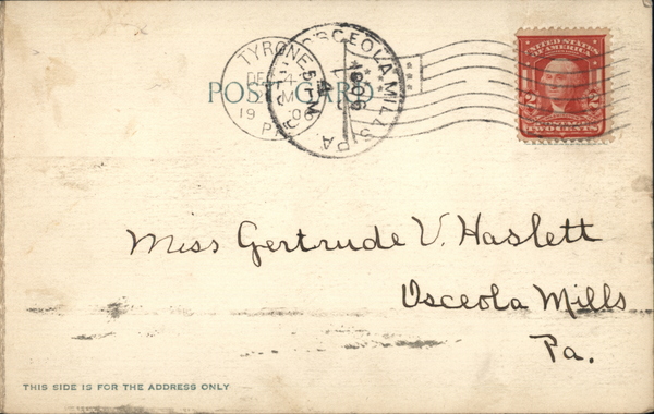 Front: AM.WOODEN, TYRONE, PA.' RESERVOIR, T RONE, PA. Nello! pertrude, Write to me Vom, Back: NE EOKA INTED STATES DEAMERICA TYI DEDRA POSTM 19 179 WOOENTS Vd Miss Gertrude V. Haslett Osceola Mills Pa.
