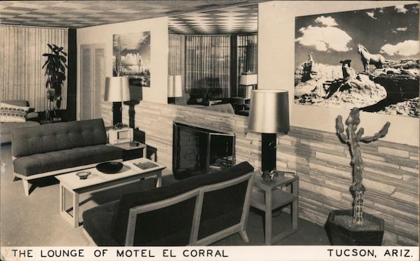 Front: THE LOUNGE OF MOTEL EL CORRAL TUCSON, ARIZ. Back: Kodak- Paper WESTERN WAYS, TUCSON, ARIZONA-COPYRIGHT PENDING.