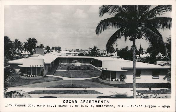 Front: OSCAR APTS HAR APTS OSCAR APARTMENTS PHONES 2-3500 – 9649 17 TH AVENUE COR. MAYO ST., 1 BLOCK E. OF U.S. 1, HOLLYWOOD, FLA. Back: Kodok STAN Pope Where me lmek a month. Its only a yea oldx localy ہے۔