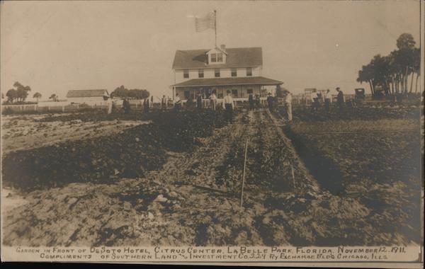 Front: Bw. GARDEN IN FRONT OF DESOTO HOTEL, CITRUS CENTER, LA BELLE PARK, FLORIDA. NOVEMBER12-1911. OF SOUTHERN LAND INVEST MmENT Co.229 Ry ExcHANGE BLOG CHICAGO. ILLS. COMPLIMEN TS Back: REAL PHOTOGRAPH BY O, M. MORRIS, EVANSTON, ILL.
