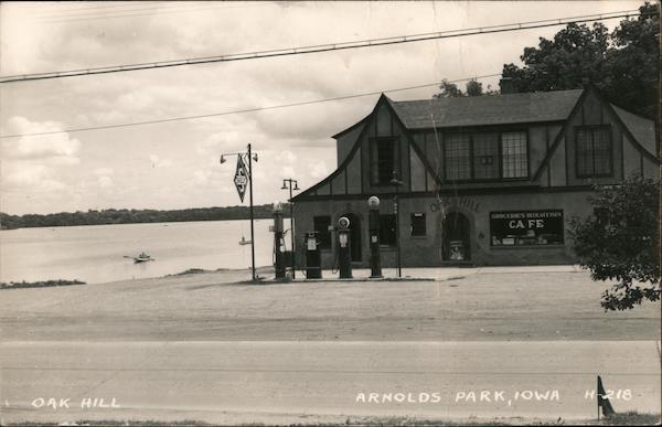 Front: SKELLY XOME oHILL GROCERIES DELICATESSEN CA FE ARNOLDS PARK IOWA H218 OAK HILL Back: This is near the anetary- Closes up in the winter lots of love to love to you and yours Selma