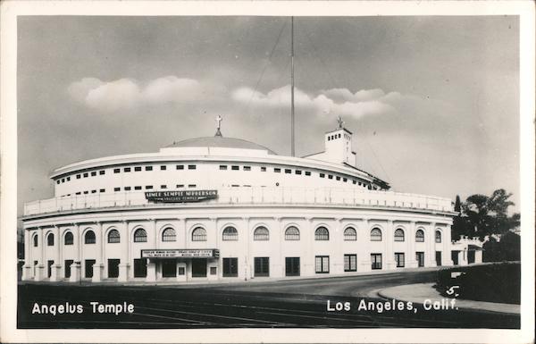 Front: AIMEE SEMPLE MEPHERSON ANGELUS TEMPLE CHAPLAIN HOWARD RUSTHOI SPEAKS SUNDAY AT 7,30 PM. "TILL DEATH US DO PART" MUSICAL HOUR Z00PM. 5. Angelus Temple Los Angeles, Calif. Back: -- LOS ANGELES PHOTO FOST CARD CO.