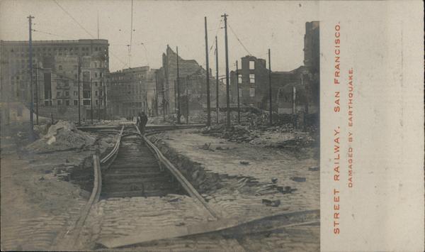 Front: STREET RAILWAY. SAN FRANCISCO. DAMAGED BY EARTHQUAKE. Back: FERHAGER EGG GGG. 666 Miller, Stewart & Beaton WHOLESALE WEEN Carpets and Draperies ОМАНА, 413-15-17 South 16th St. NEW QUARTERS After September Ist NEB. FONDA BROS & CO,, OMAHA.