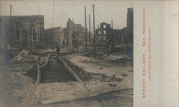Front: STREET RAILWAY. SAN. FRANCISCO. DAMAGED BY EARTHQUAKE. Back: Nothing but address on this side. MADE BY PHOTO.CO. OF AM., CHICAGO