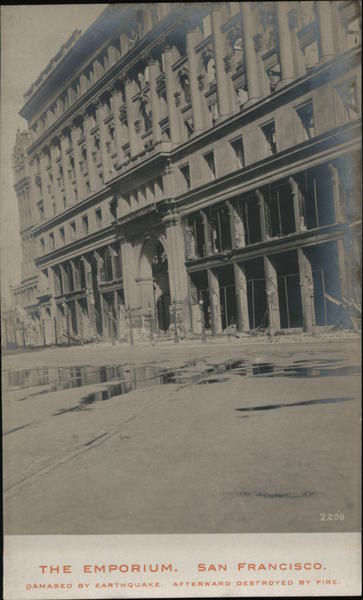 Front: 2208 THE EMPORIUM. SAN FRANCISCO. DAMAGED BY EARTHQUAKE. AFTERWARD DESTROYED BY FIRE. Back: Nothing but address on this side. COPYRIGHT, 1906, BY PHOTO.CO. OF AM., CHICAGO