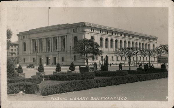 Front: PUBLIC LIBRARY- SAN FRANCISCO Back: REAL ste lired gaat across she streetfrom this, in 1930, at I Gel Confe PACIFIC NO''ELTY CO. SAN FRANCISCO LOS ANGELES