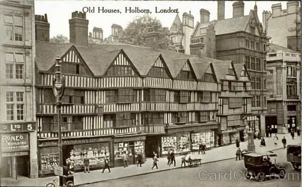 | Old Houses, Holborn. - Known also as Staple Inn, Holborn Bars. These old Houses are one of the few symbolic landmarks of the past history of London, and the old courtyard behind offers to the Jaded visitor or citizen a restful retreat. It was here that Dr. Johnson wrote his famous "Rasselas." |