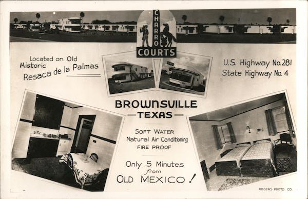 Front: COURTS Located on Old Historic U.S. Highway No.281 State Highway No. 4 CAFE BEER BROWNSUILLE =TEXAS= SOFT WATER Natural Air Conditioning FIRE PROOF Only 5 Minutes OLD MEXICO ! ROGERS PHOTO CO. CHARRO Back: SS 0 Q2370 10