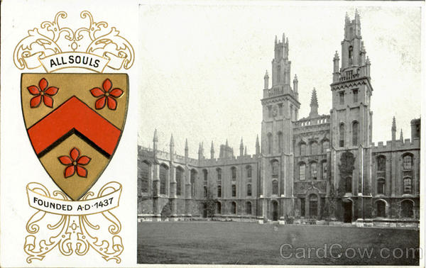 Front: ALL SOULS ( FOUNDED A·D•1437 Back: it for Inland Postage, but the right hand side must be reserved for address and stamp only. on this side.